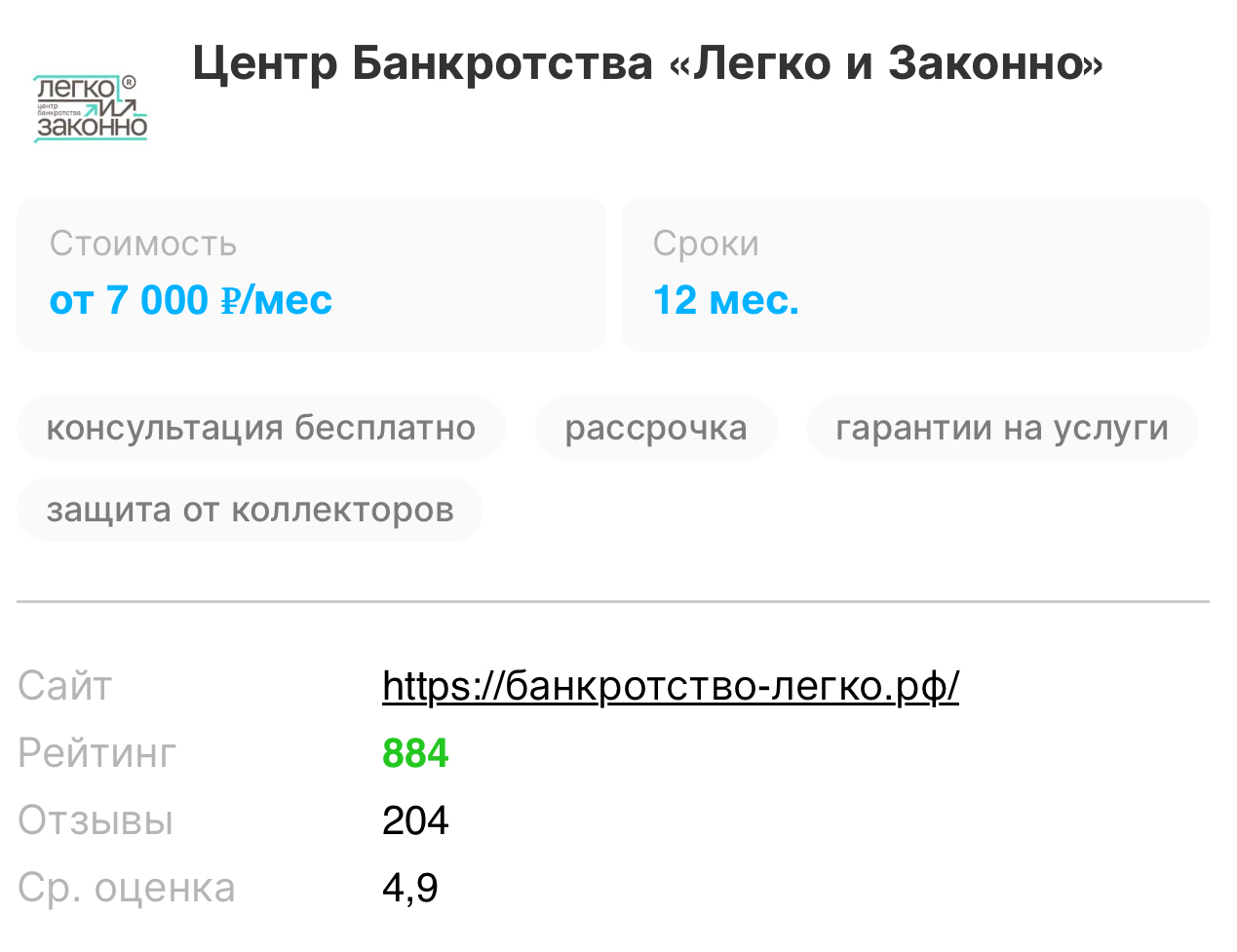 В связи с большими финансовыми проблемами мне пришлось обратиться в центр банкротства " Легко и законно" . В ходе процедуры по списанию долгов сотрудники постоянно были на связи и морально поддерживали по всем текущим вопросам за, что им хочется выразить огромную благодарность. Хорошо, что есть такие компании, которые готовы помочь тем кто оказался в трудной жизненной ситуации.