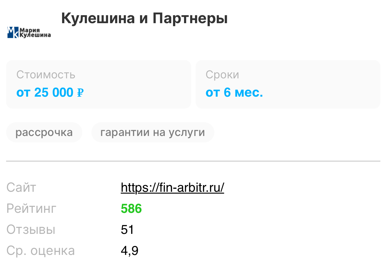 Благодарю всю команду Марии Кулешиной.Процедура завершена полным списанием долгов, теперь свобода. Всем рекомендую