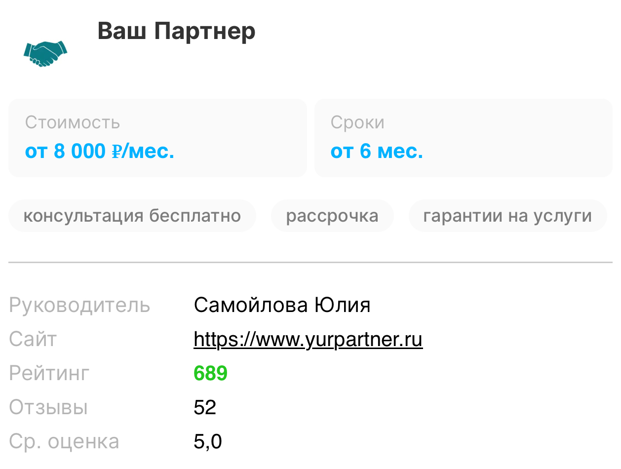 Выражаю огромную благодарность юристам фирмы "Ваш партнёр". Отличные специалисты всегда на связи, по любым вопросам отвечают на доступном языке. Результатом полностью довольна. Спасибо вам🙂